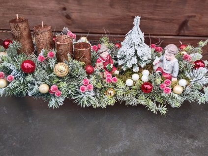 Adventní svícen s dětmi Svícen na keramickém tácu, dozdoben látkovými a umělými květinami, dekorací z polyresinu Délka 43 cm, šířka 11cm, výška cca 19 cm