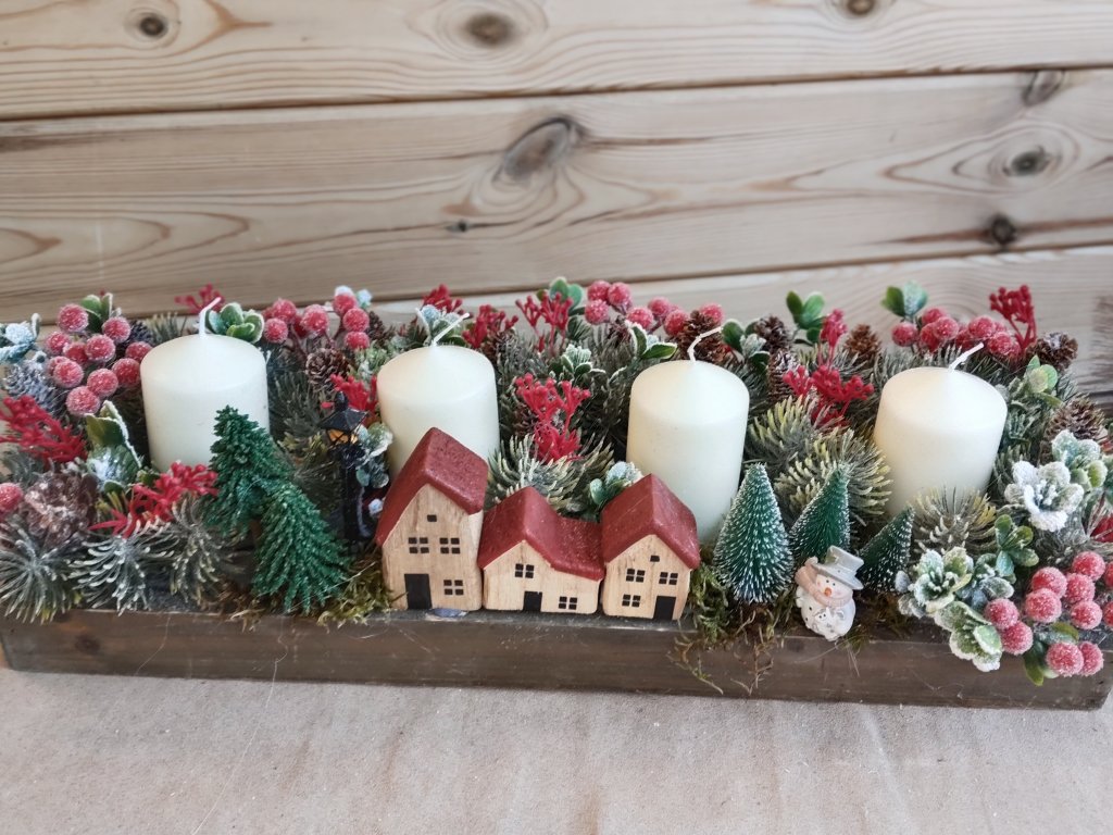 Svícen na dřevěném tácu, dozdoben látkovými a umělými květinami