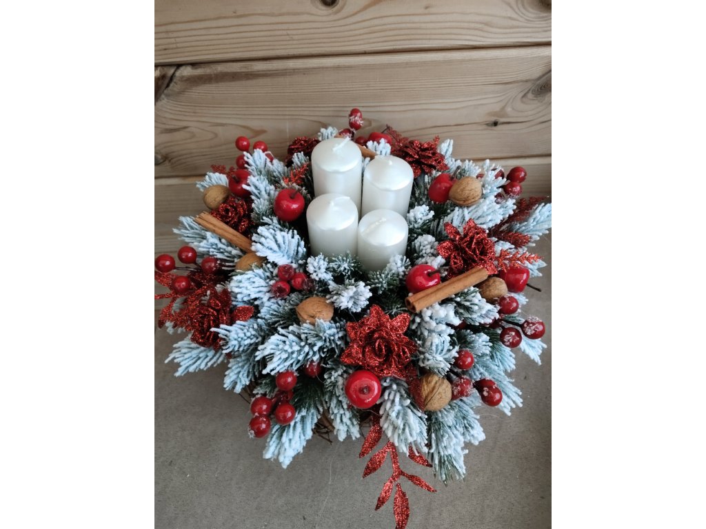 Věnec na proutěném korpusu dozdoben látkovými a umělými květinami