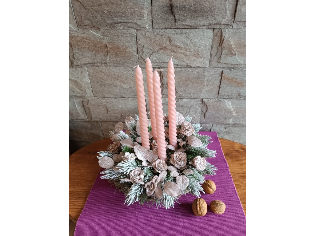 Adventní věnec na proutěném korpusu, dozdoben umělými květinami a jehličím. Rozměr cca šířka 24 cm, výška včetně svíček 28 cm. Svíčky nenechte hořet bez dozoru!