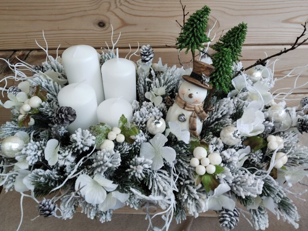Vánoční aranžmá ve dřevěném šuplíku dozdoben umělými a látkovými květinami