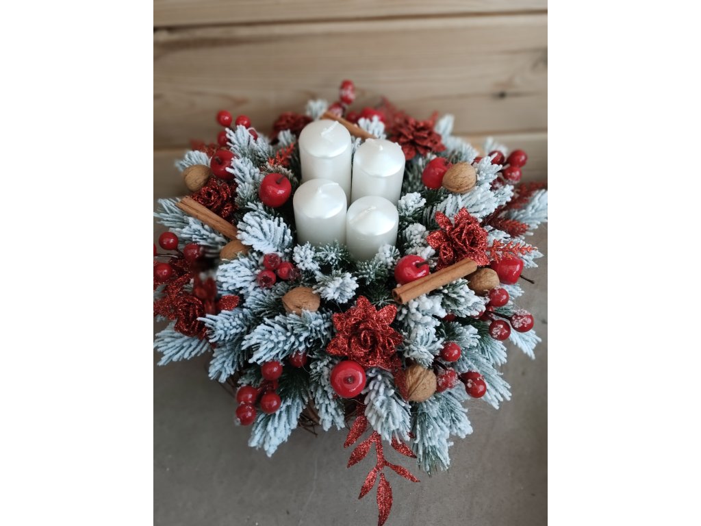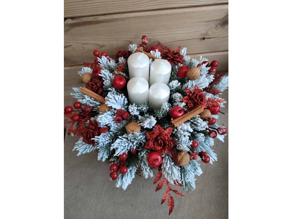 Věnec na proutěném korpusu dozdoben látkovými a umělými květinami