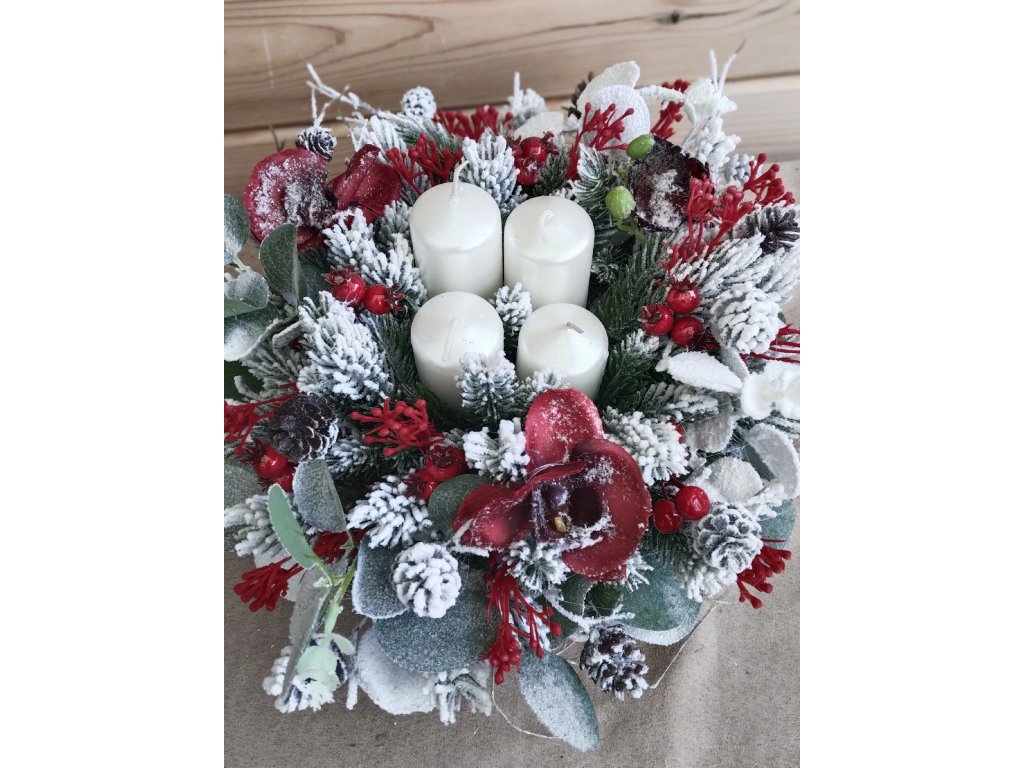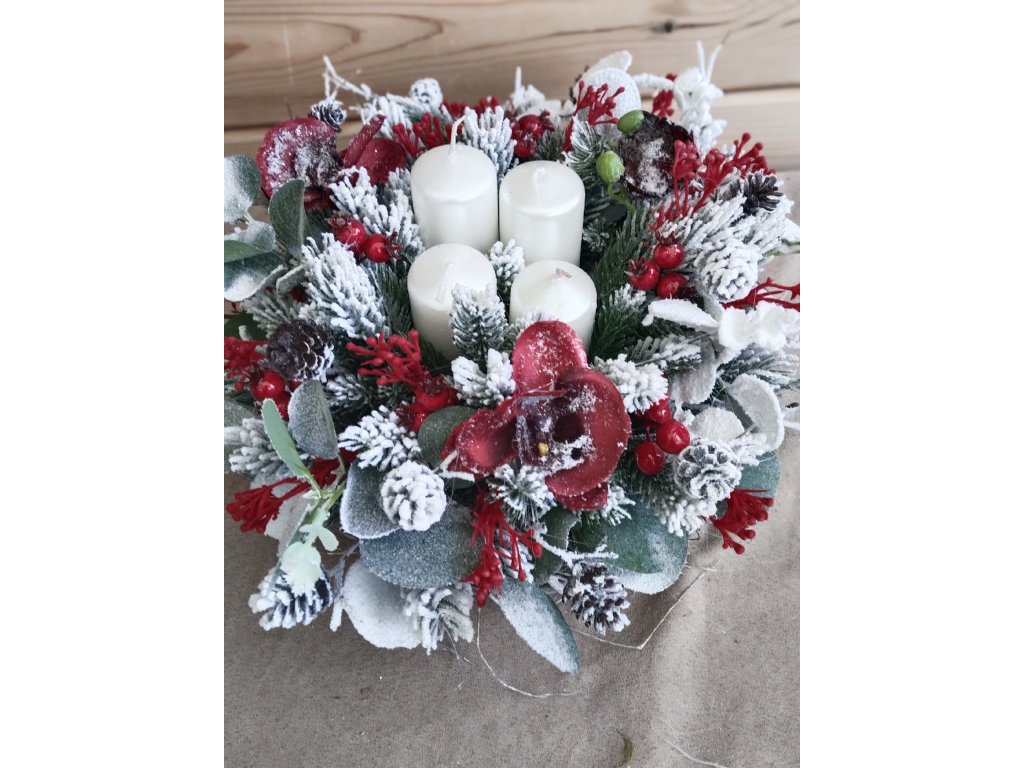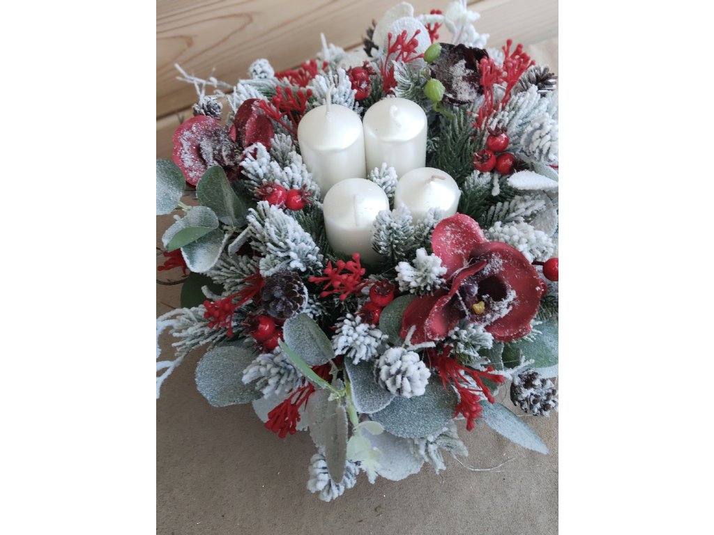 Adventní zasněžený věnec na proutěném korpusu, dozdoben látkovými a umělými květinami