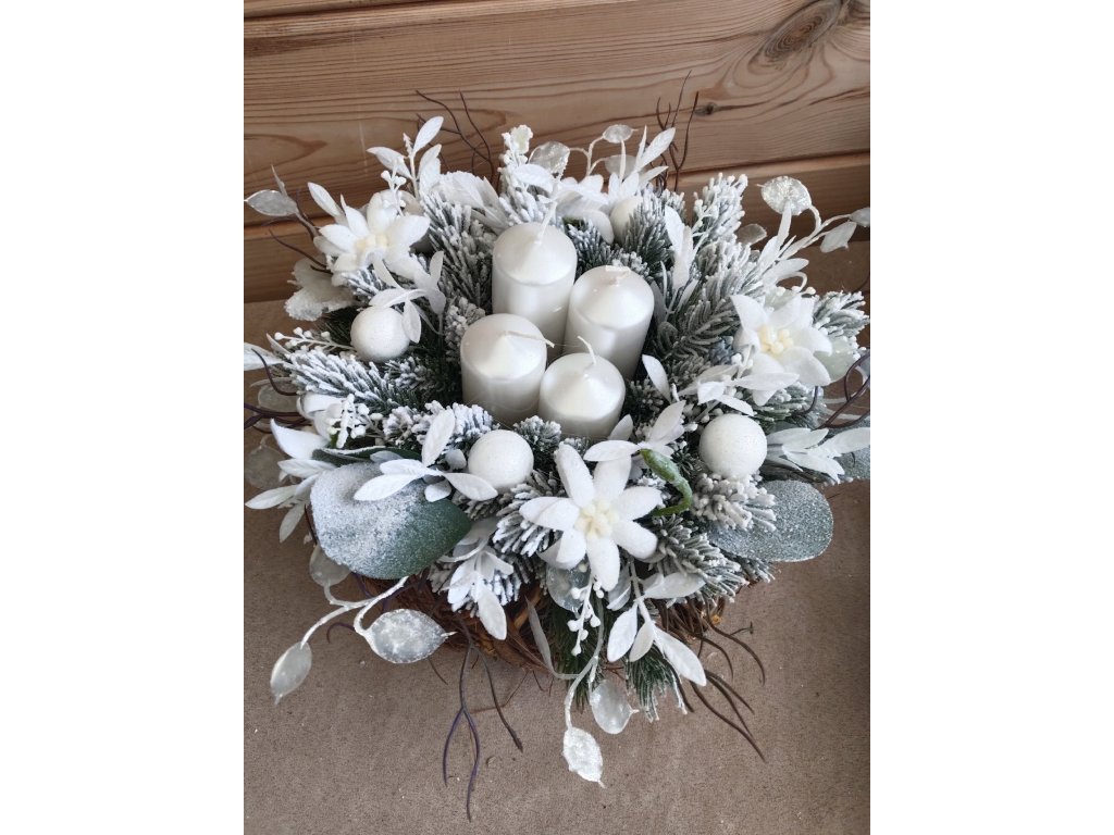 Průměr cca 25 cm, dozdoben látkovými a umělými květinami