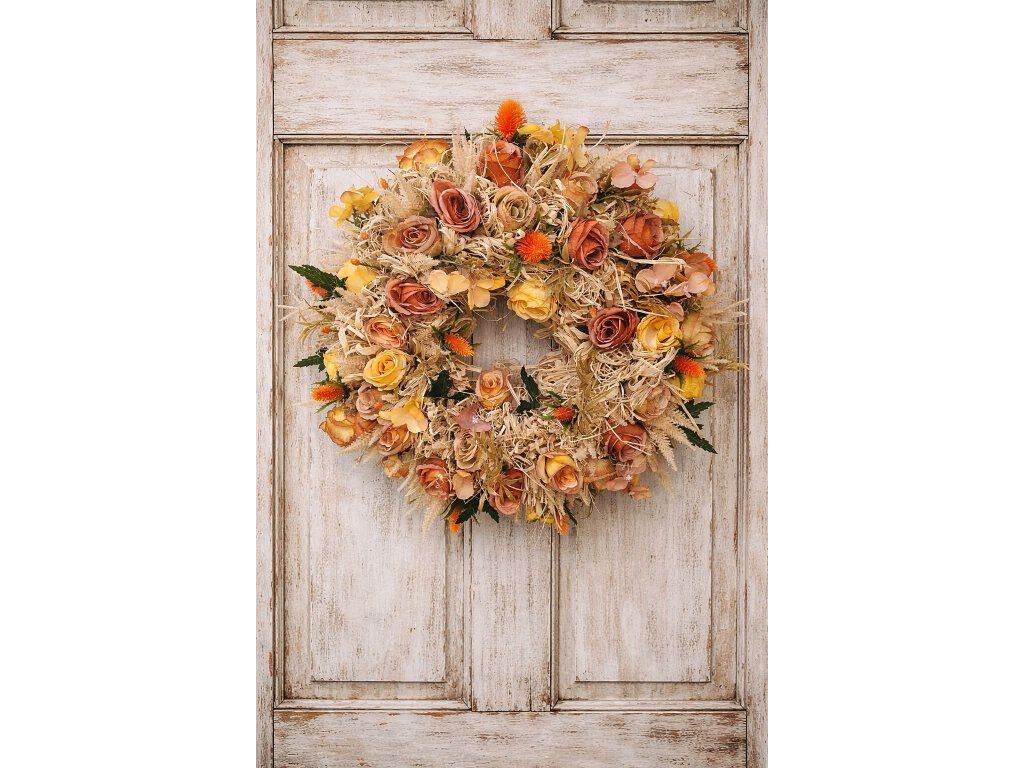 Celoroční věnec na slámovém korpusu, dozdoben látkovými a umělými květinami, přírodním lýkem.