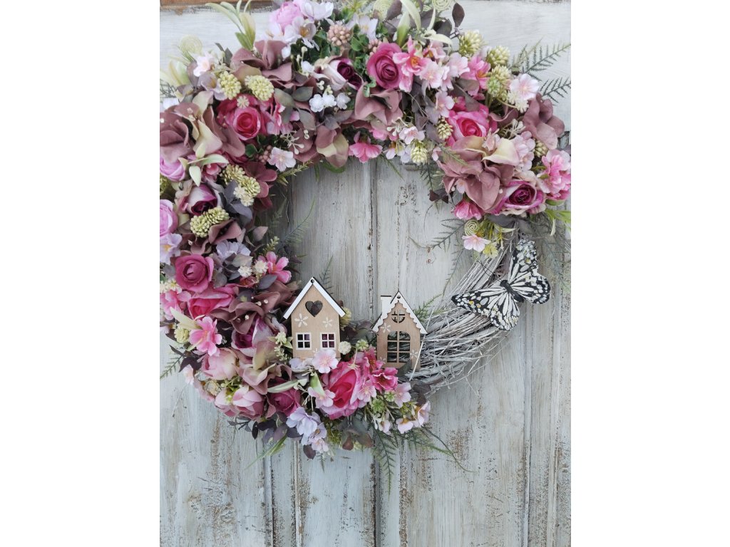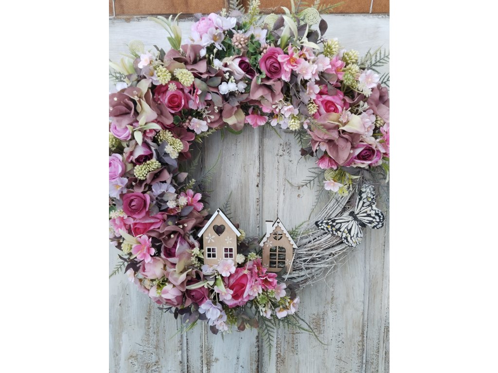 Celoroční věnec na proutěném korpusu, dozdoben látkovými a umělými květinami