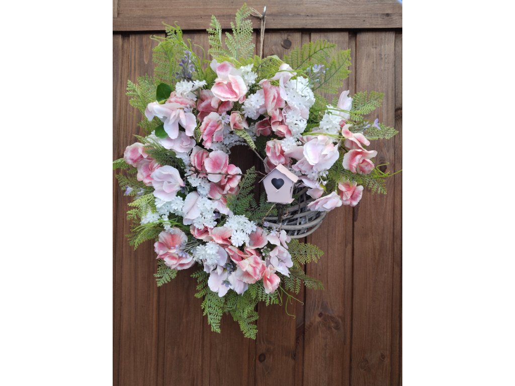 Celoroční věnec,na proutěném korpusu, dozdoben látkovými a umělými květinami