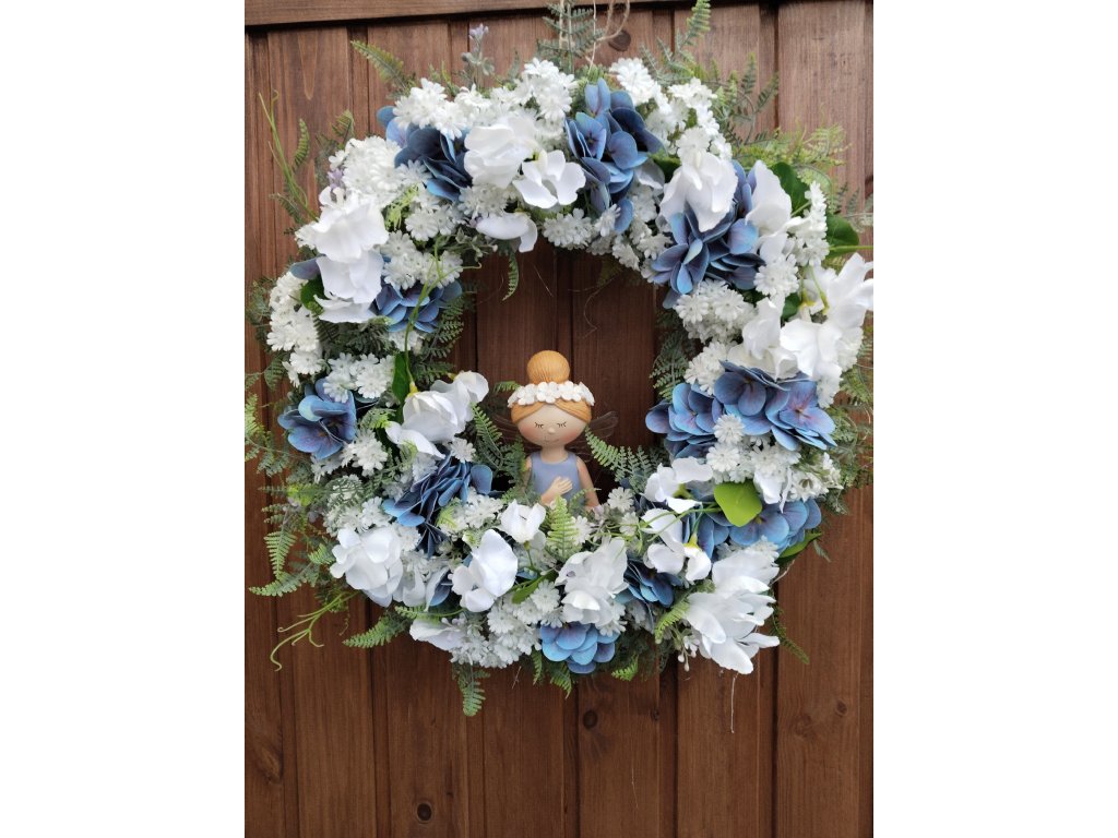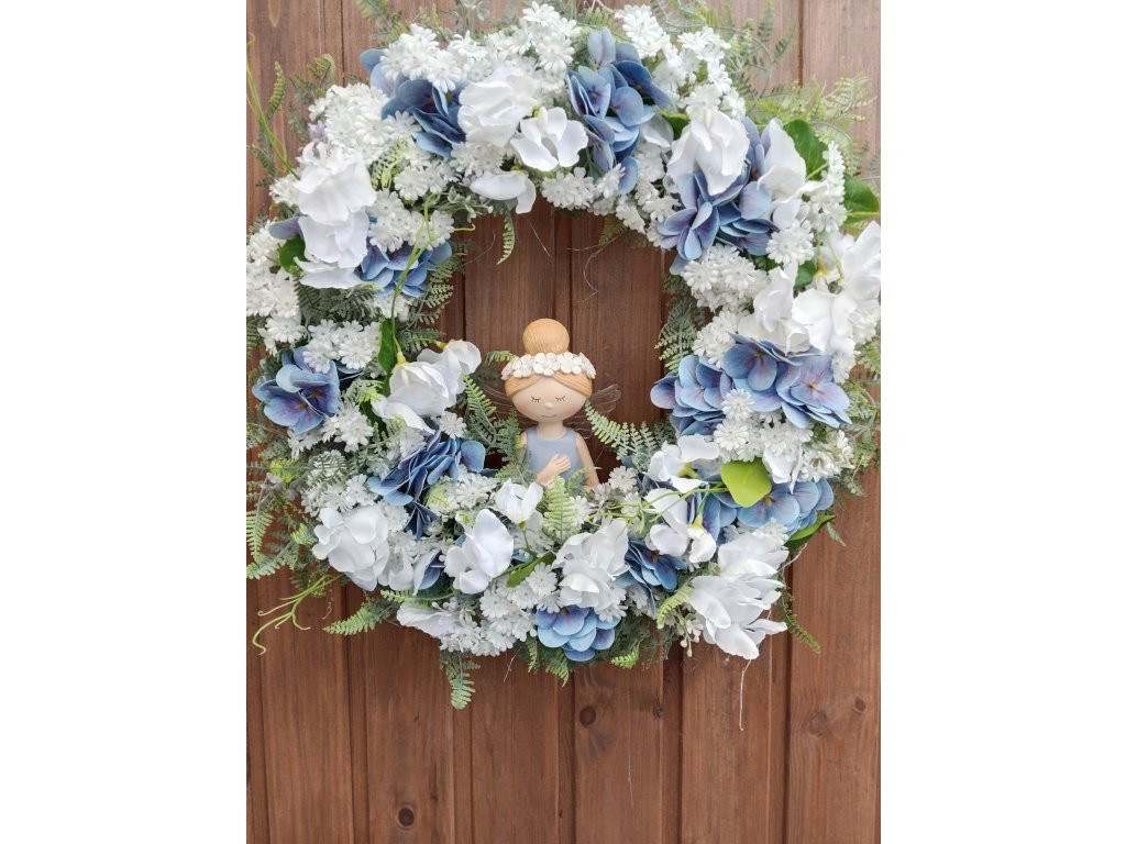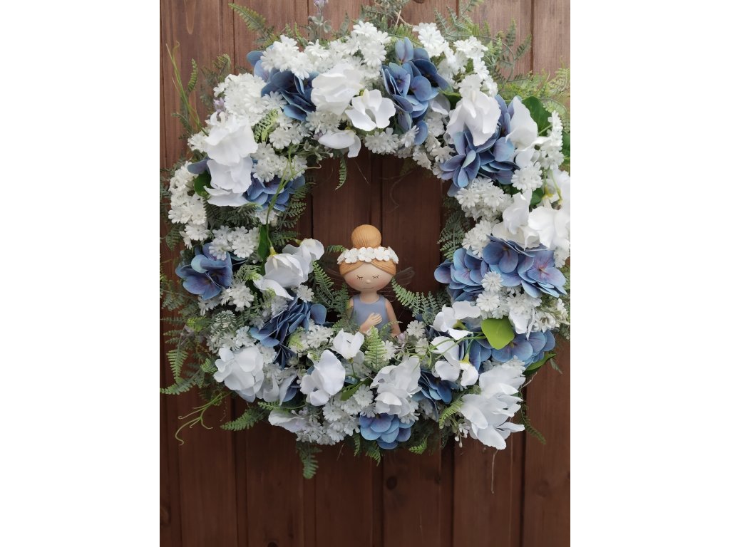 Celoroční věnec, na proutěném korpusu dozdoben látkovými a umělými květinami.