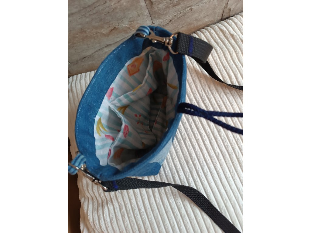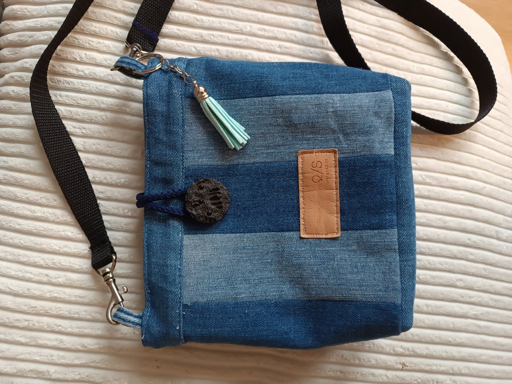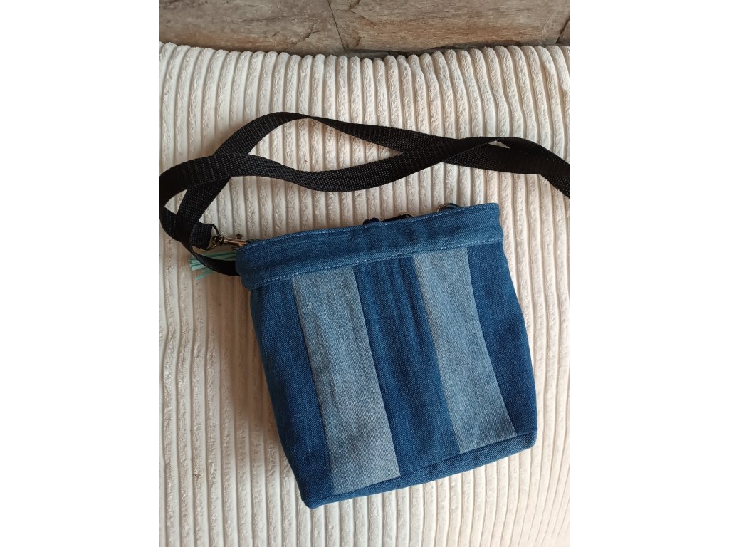 Taštička je ušitá z recyklované džínoviny, je vypodšívkovaná, uvnitř jsou dvě kapsy. Zapínání na knoflík. Kabelku zdobí přívěsek střapec. Šířka cca 21 cm, výška 19 cm, ucha 150 cm . Prát na 30°C, mírně ždímat.