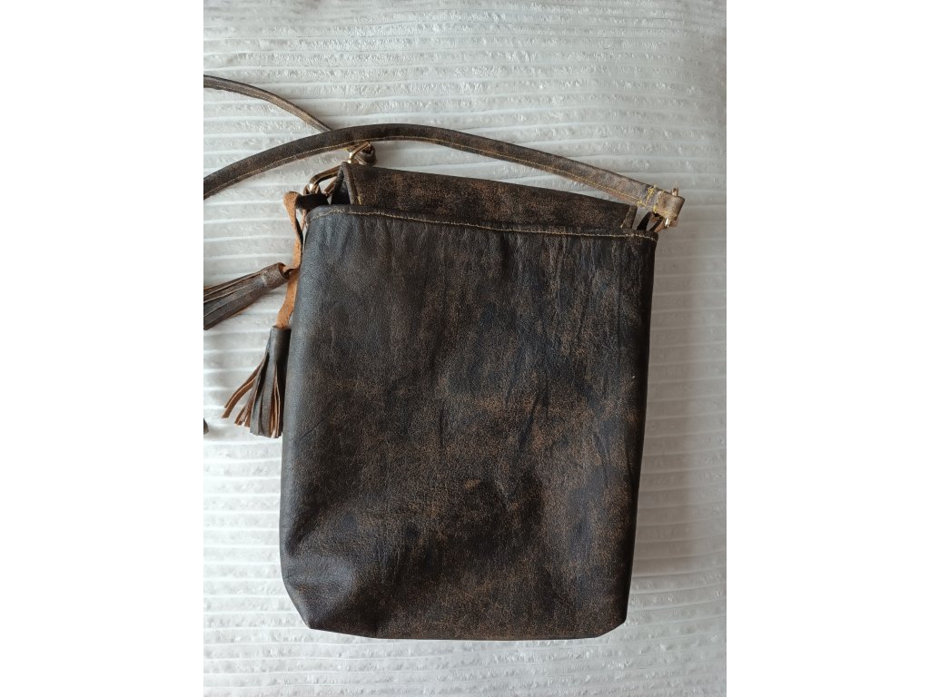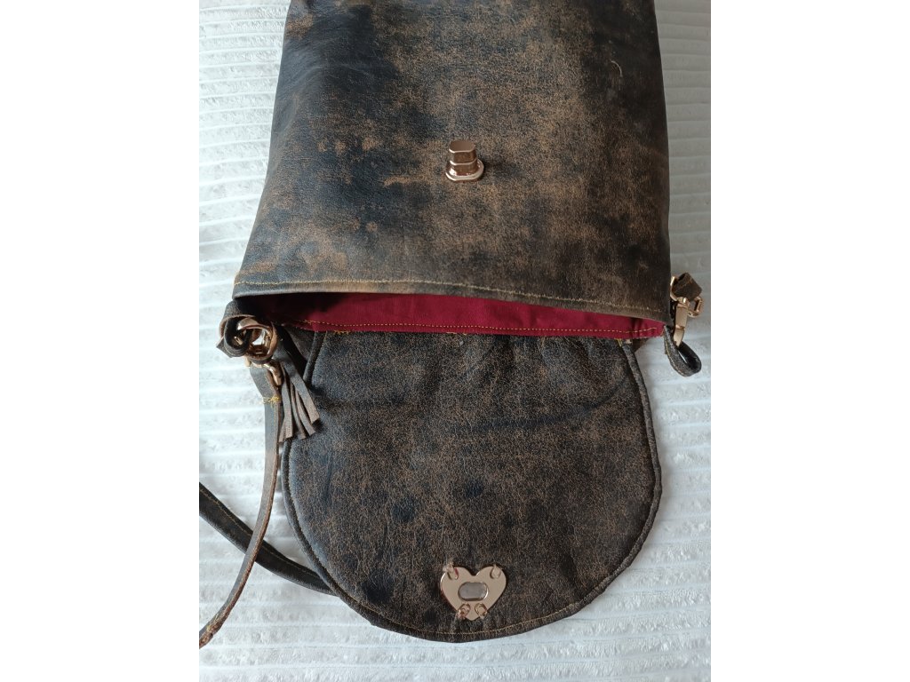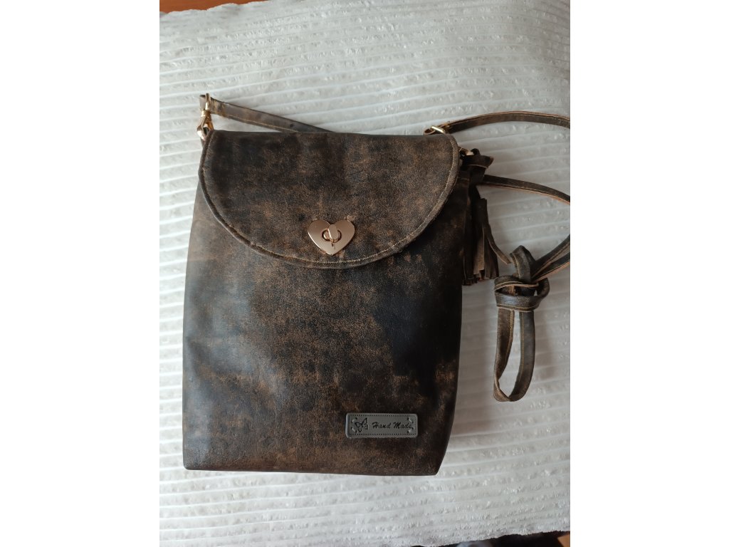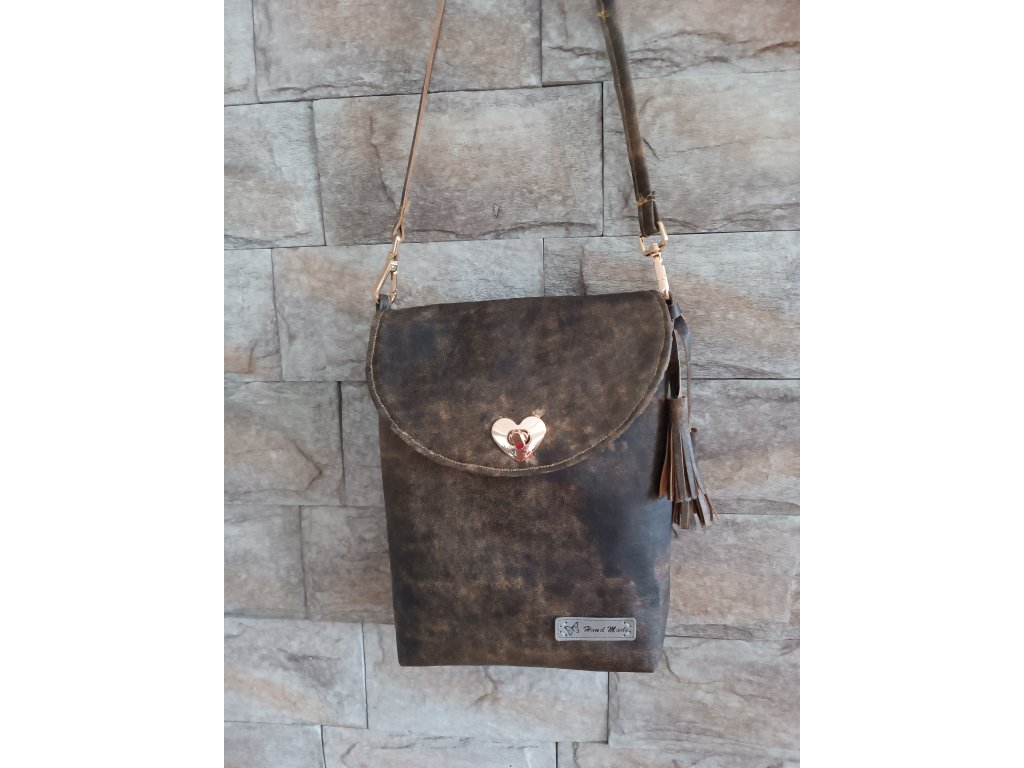 Taštička je ušitá z recyklované kůže je vypodšívkovaná a má odšité dno. Zapínání zámečkové ve tvaru srdíčka. Ucho dlouhé cca 125 cm. Kabelku zdobí přívěsek ze dvou střapců.