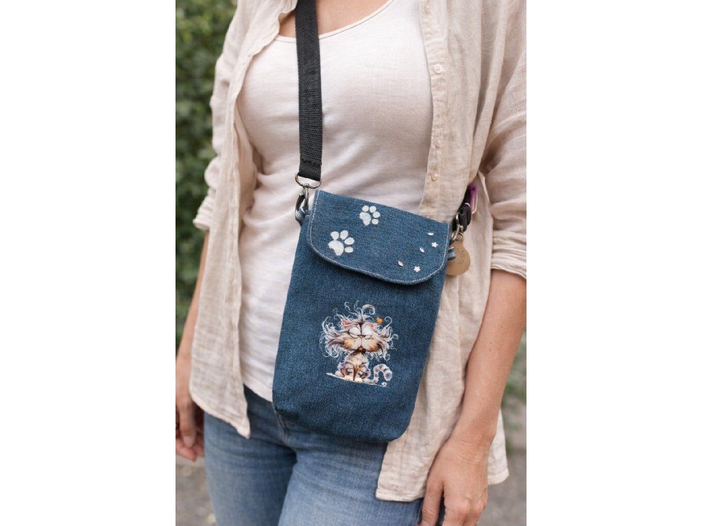 Malá crossbody taštička ušitý z recydžínoviny. Má bavlněnou podšívku , odšité dno a zapínání na magnet. Rozměr cca výška 23, šířka 14 cm. Prát na 30°C, mírně ždímat, obrázek žehlit přes pečící papír.