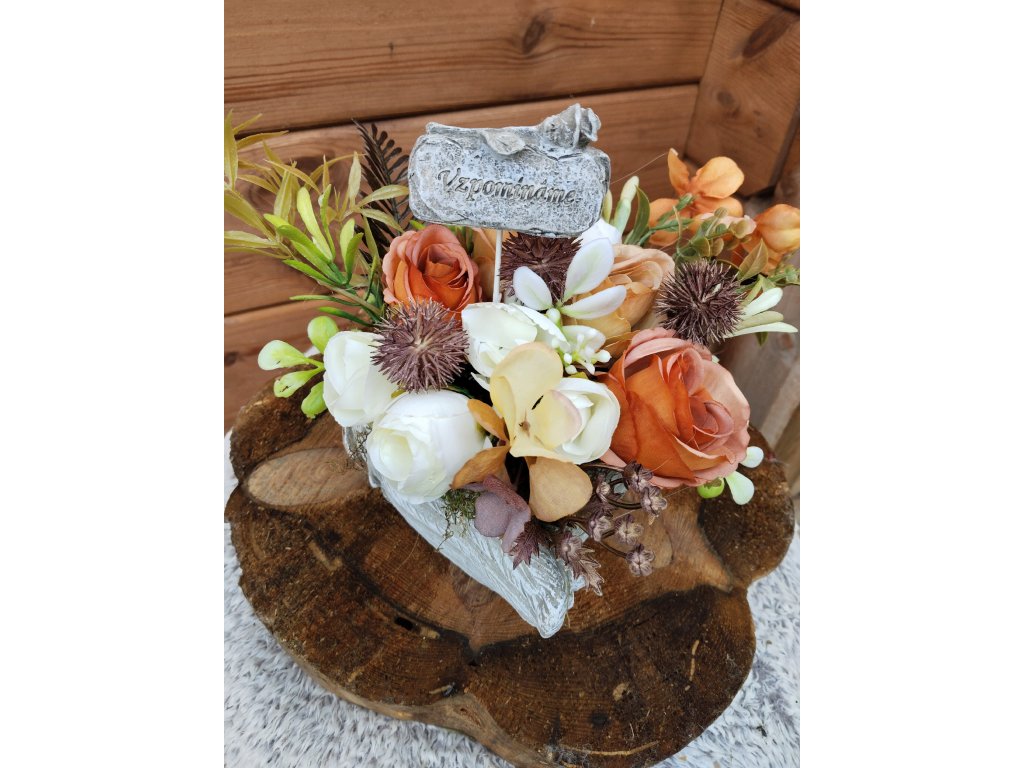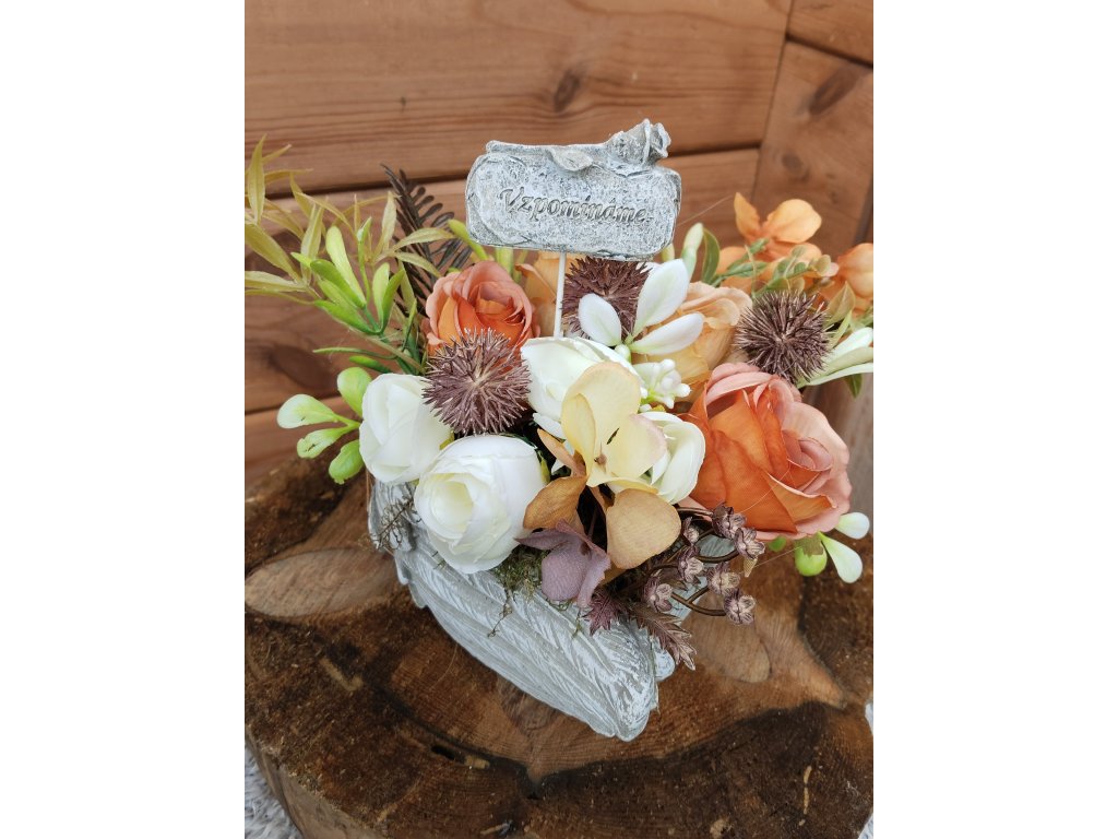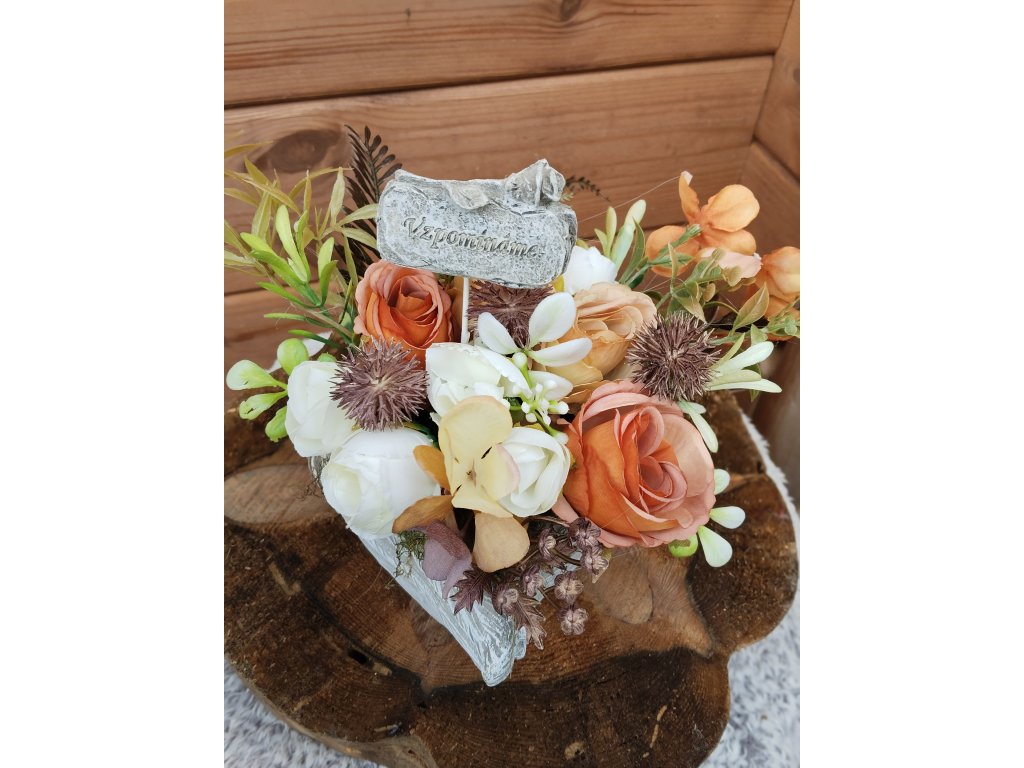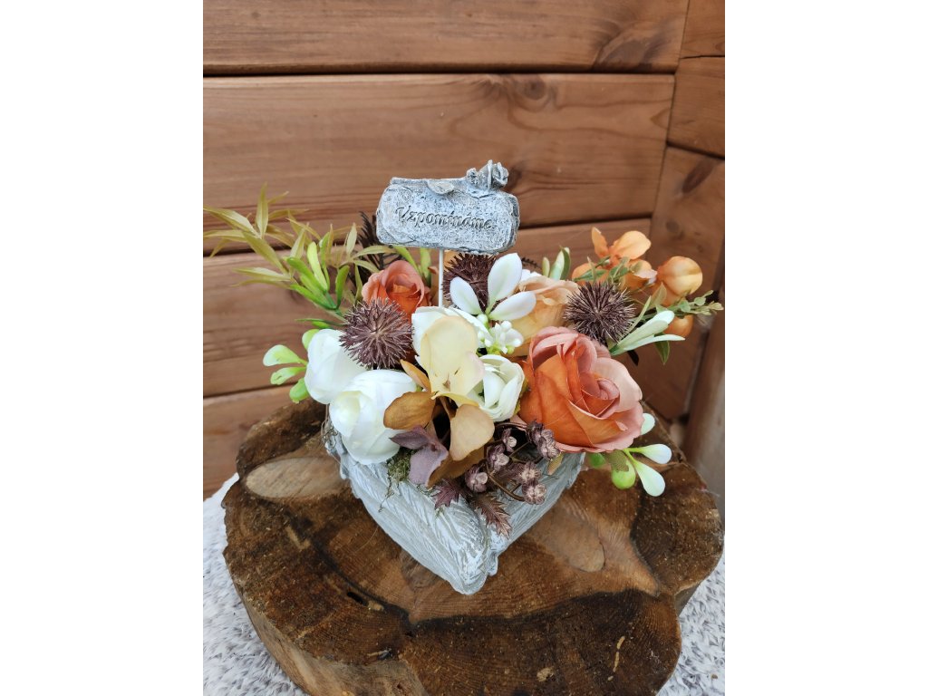 Dekorace z betonu/ cement ve tvaru srdce, dozdoben látkovými a umělými květinami