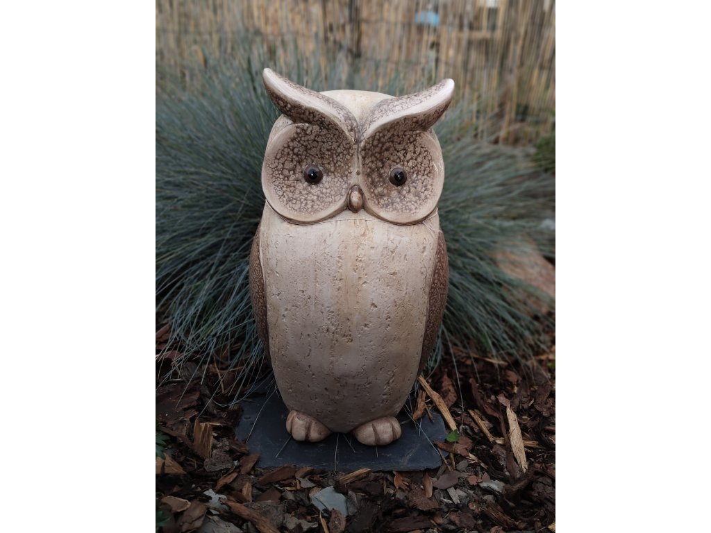Sova z magnesia v přírodních béžových a hnědých odstínech je působivou zahradní dekorací, která v sobě spojuje eleganci i roztomilost. Díky svému výraznému vzhledu se hodí jako originální ozdoba k rostlinám, na schody i pod strom. Milý společník, který dodá vaší zahradě příjemnou atmosféru