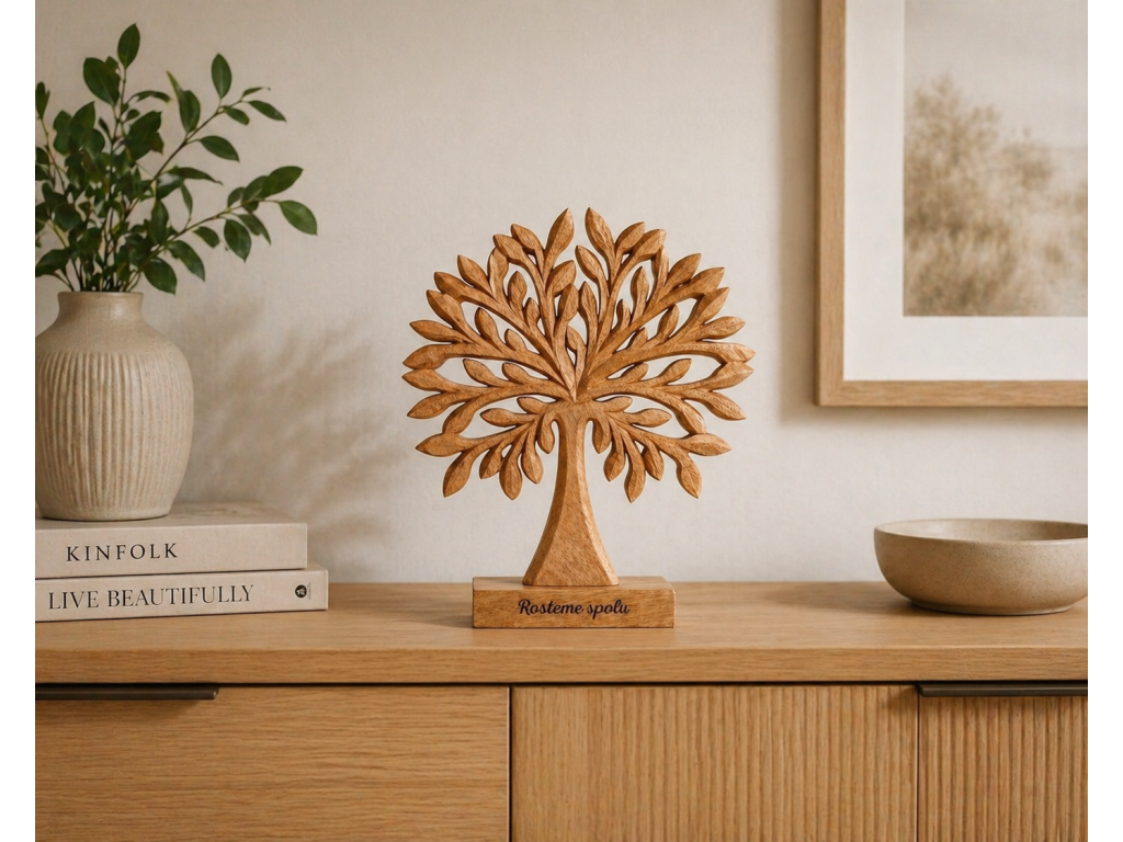 Dřevěný strom z mangového dřeva s nápisem „Rosteme spolu“ 27 cm