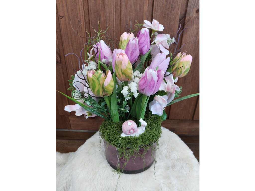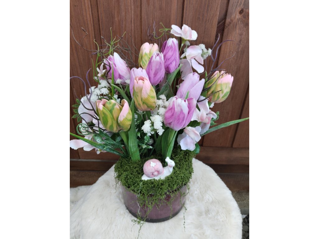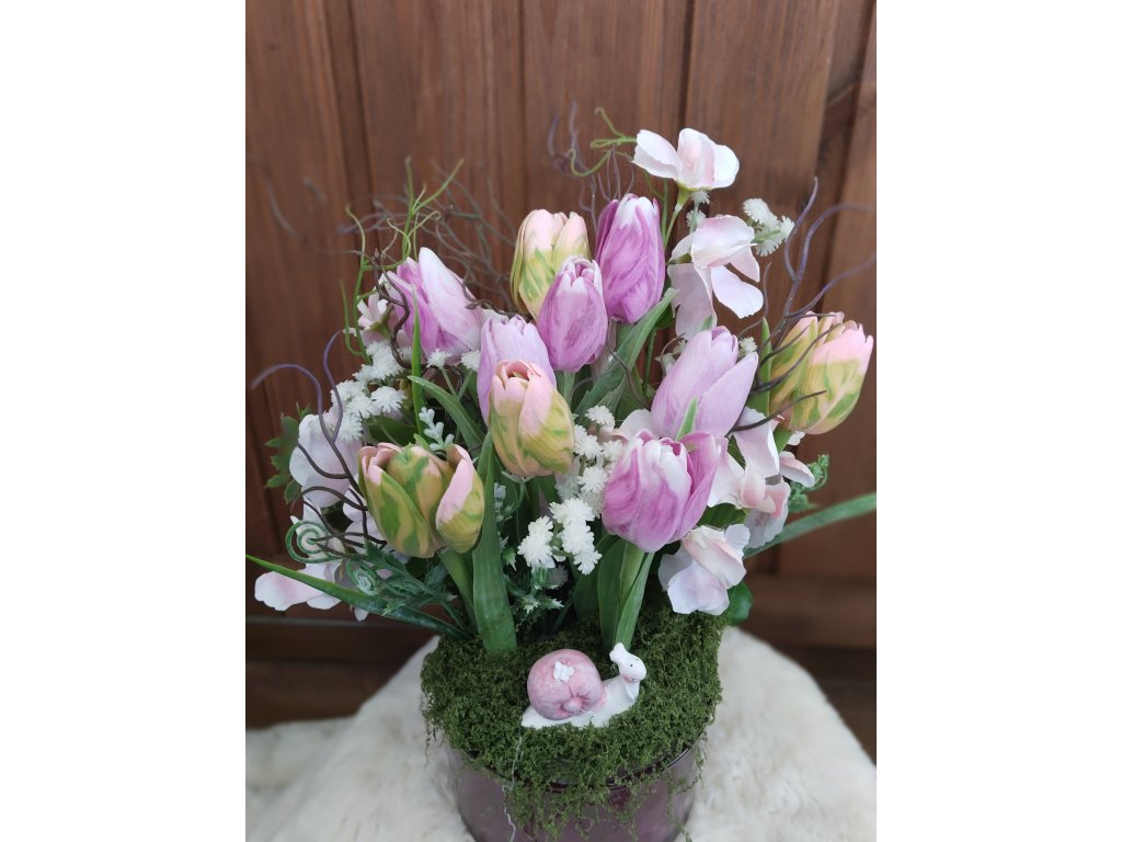 Aranžmá ve skleněné nádobě, dozdobeno látkovými a umělými květinami.