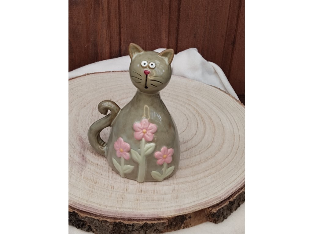 Keramická figurka kočky v zeleném odstínu je zdobená jemnými růžovými květy, které zvýrazňují její dekorativní charakter. Figurku lze pohodlně postavit na poličku, komodu nebo okenní parapet, kde přispěje k příjemné atmosféře interiéru. Povrch je hladký a lesklý, což podtrhuje detailní zpracování a barevné provedení. Velikost M umožňuje snadné umístění v různých prostorách bez zbytečného zabírání místa.