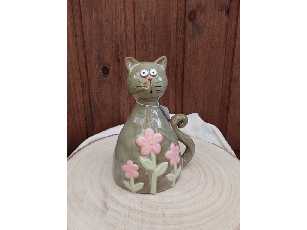 Keramická figurka kočky v zeleném odstínu je ozdobena jemnými květinovými motivy v růžové barvě, které dodávají dekoraci hravý a příjemný vzhled. Je určena k postavení a díky svému kompaktnímu provedení se hodí do různých interiérů, kde přispívá k útulné atmosféře. Povrch je hladký a lesklý, což podtrhuje detailní zpracování a barevnou kombinaci. Figurku lze umístit na poličku, komodu nebo pracovní stůl jako stylový doplněk.