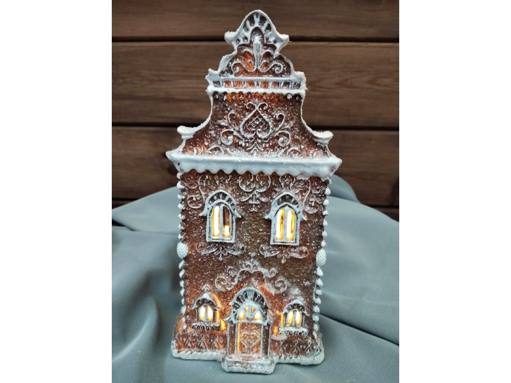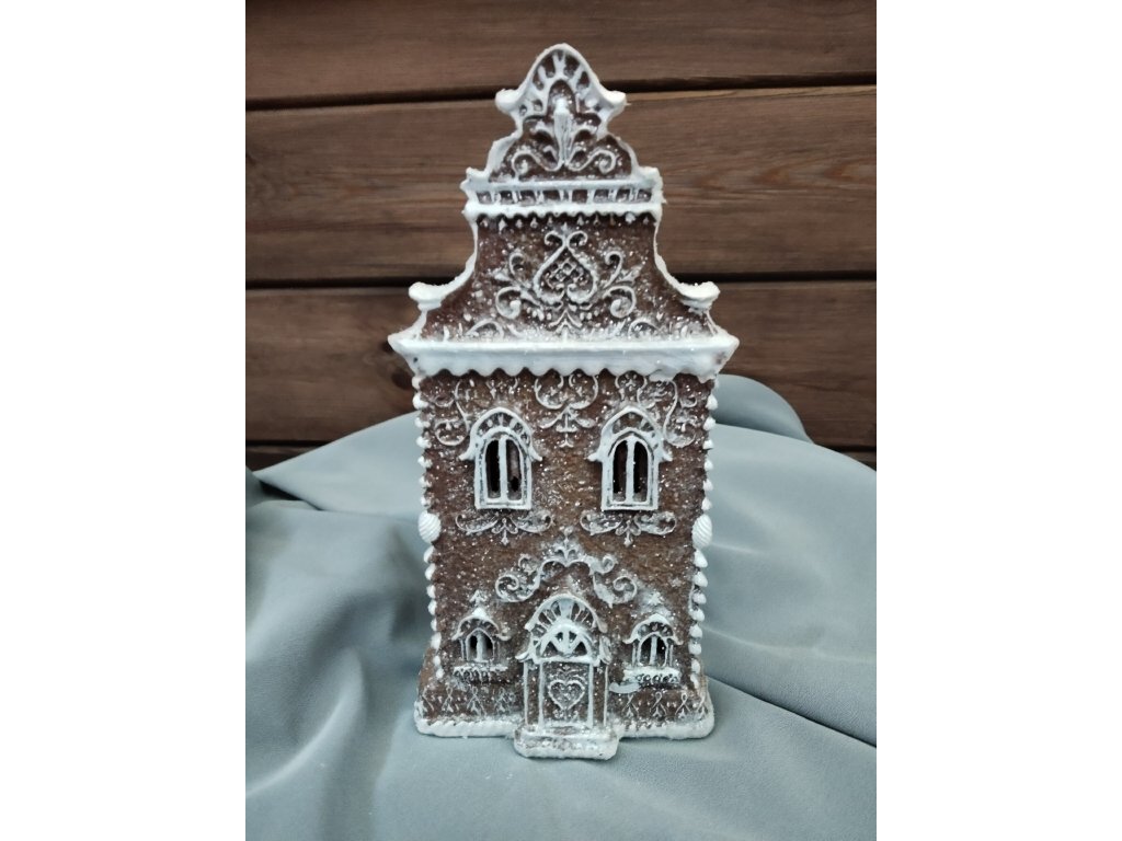Polyresinová stolní dekorace, v podobě zdobeného patrového domku v perníkovém designu, bude nádhernou dekorací pro kouzelné vánoční období. Vypadá jako by byl skutečně vytvořen z perníku a ozdoben sladkou bílou polevou. To ale ještě není vše! Díky zabudovanému LED osvětlení uvnitř, si můžete po jeho rozsvícení vychutnávat pohled na nádherně rozptýlené paprsky, které vycházejí skrze všechna okénka ven.