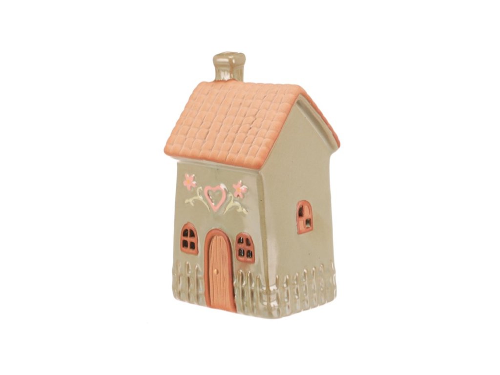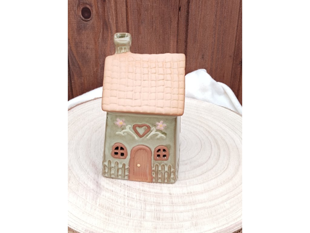 V zeleném odstínu je určený pro umístění čajové svíčky, která v něm vytváří příjemnou a teplou atmosféru. Detailní zpracování střechy s reliéfními taškami a jemné malované květinové motivy dodávají dekoraci rustikální kouzlo. Otvory ve tvaru oken a dveří umožňují průchod světla, čímž vzniká dekorativní světelný efekt. Kompaktní velikost S umožňuje snadné umístění na poličku, stůl nebo parapet. Provedení z keramiky zajišťuje stabilitu a snadnou údržbu.