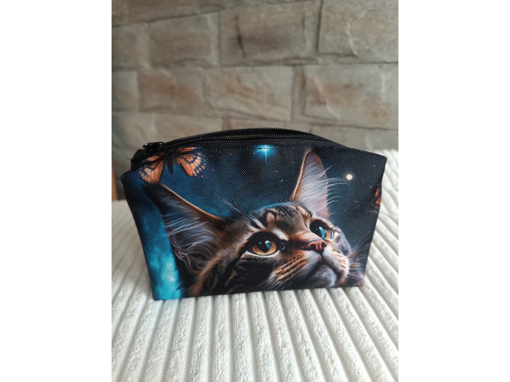 Taštička je ušitá z kočárkoviny, je vypodšívkovaná, zapínání na zip. Rozměr cca výška 13 cm, šířka 19 cm, má odšité dno. Prát ručně na 30°C, neždímat.