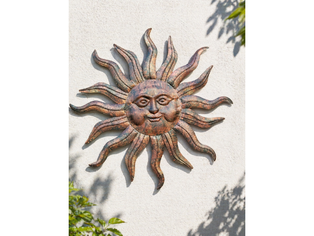 Nástěnná dekorace ve tvaru slunce je vyrobena z kovu v měděném odstínu, který dodává teplý a výrazný vizuální efekt. Detailní zpracování s výraznými paprsky a plastickým obličejem vytváří zajímavý dekorativní prvek vhodný pro různé interiéry i venkovní prostory.