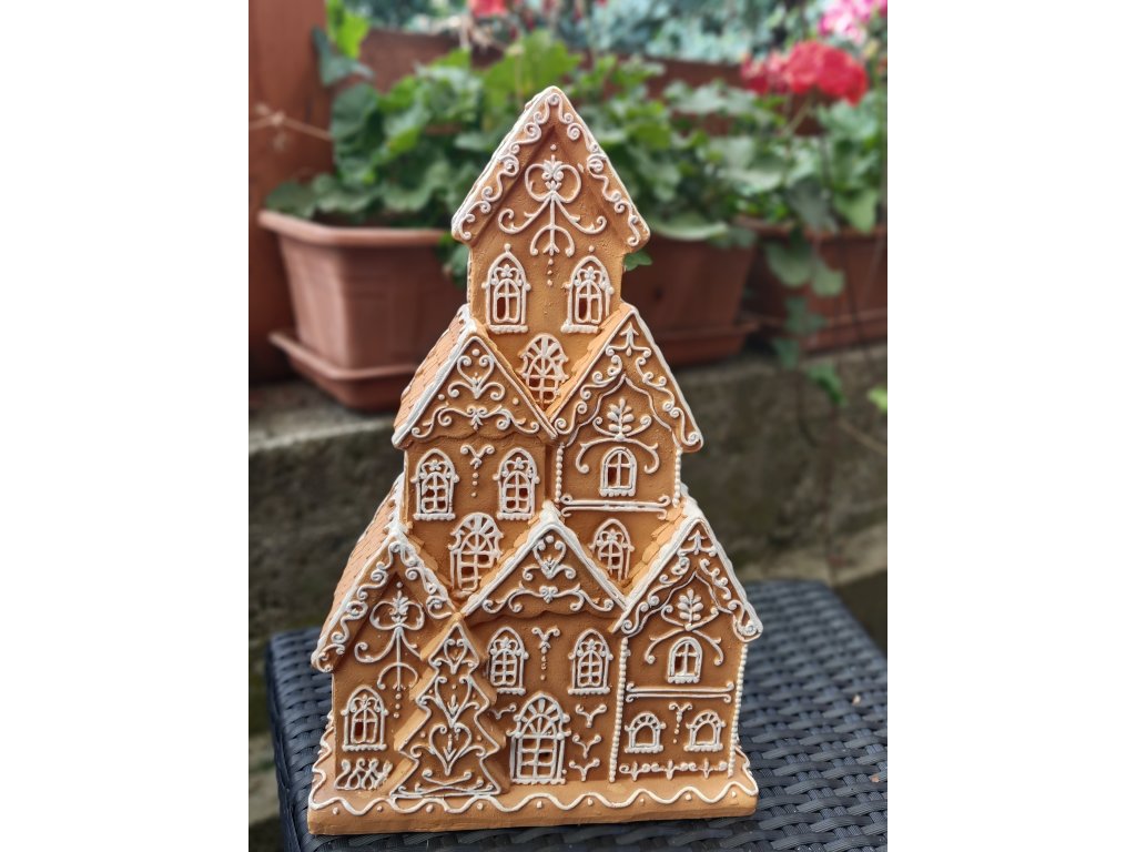 Perníkový domek s Led světlem Polyresinová stolní dekorace, v podobě zdobeného patrového domku v perníkovém designu, bude nádhernou dekorací pro kouzelné vánoční období. Vypadá jako by byl skutečně vytvořen z perníku a ozdoben sladkou bílou polevou. To ale ještě není vše! Díky zabudovanému LED osvětlení uvnitř, si můžete po jeho rozsvícení vychutnávat pohled na nádherně rozptýlené paprsky, které vycházejí skrze všechna okénka ven.