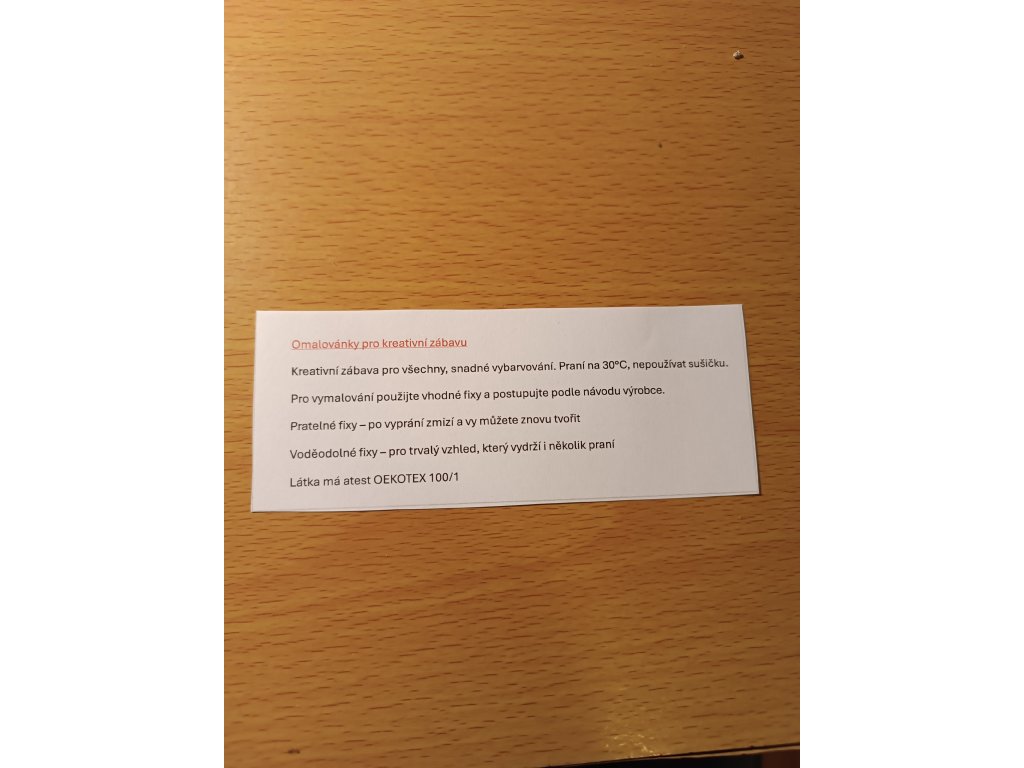 Polštářek je ušitý ze 100% bavlněné látky (látka má atest OEKOTEX 100/1. Rozměr 29,5 cm x 21 cm. Polštářek je zabalený v e foliovém sáčku. Kreativní malování pro všechny, snadné vybarvování. Pro vymalování použijte vhodné fixy a posupujte podle návodu výrobce.