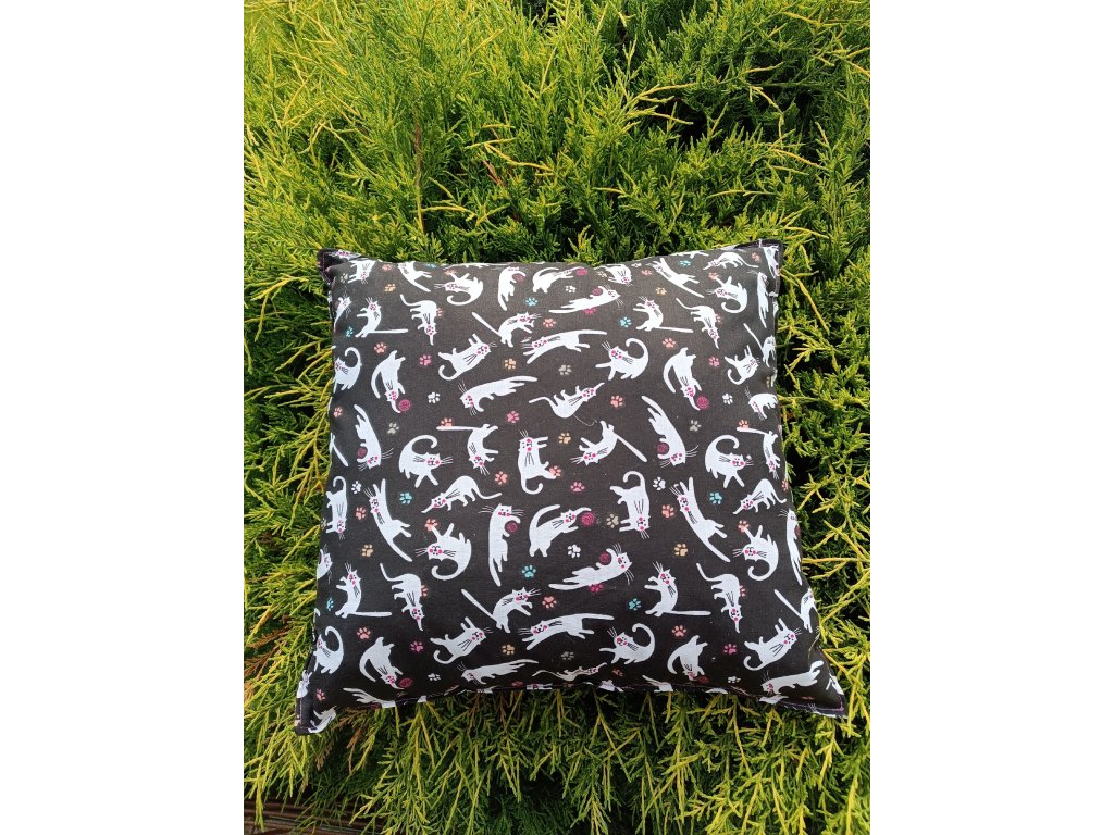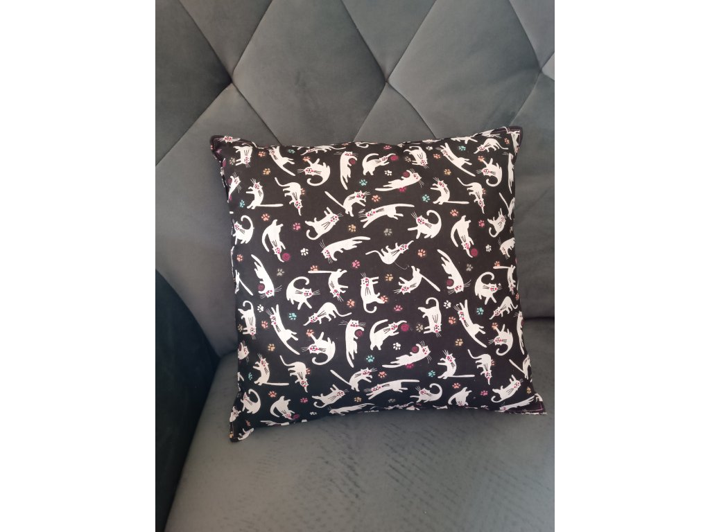 Polštářek je ušitý z bavlněné látky, je oboustranný, vyplněný dutým vláknem. Rozměr cca 34 x 34 cm. Prát na 30°C, mírně ždímat, nesušit v sušičce.
