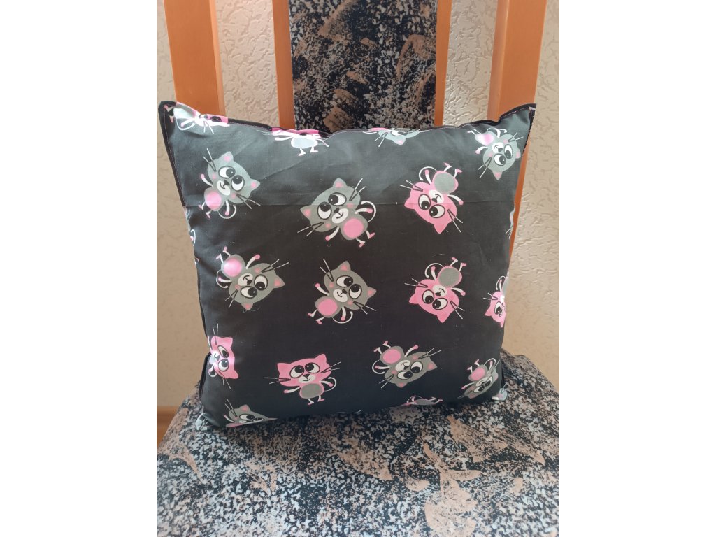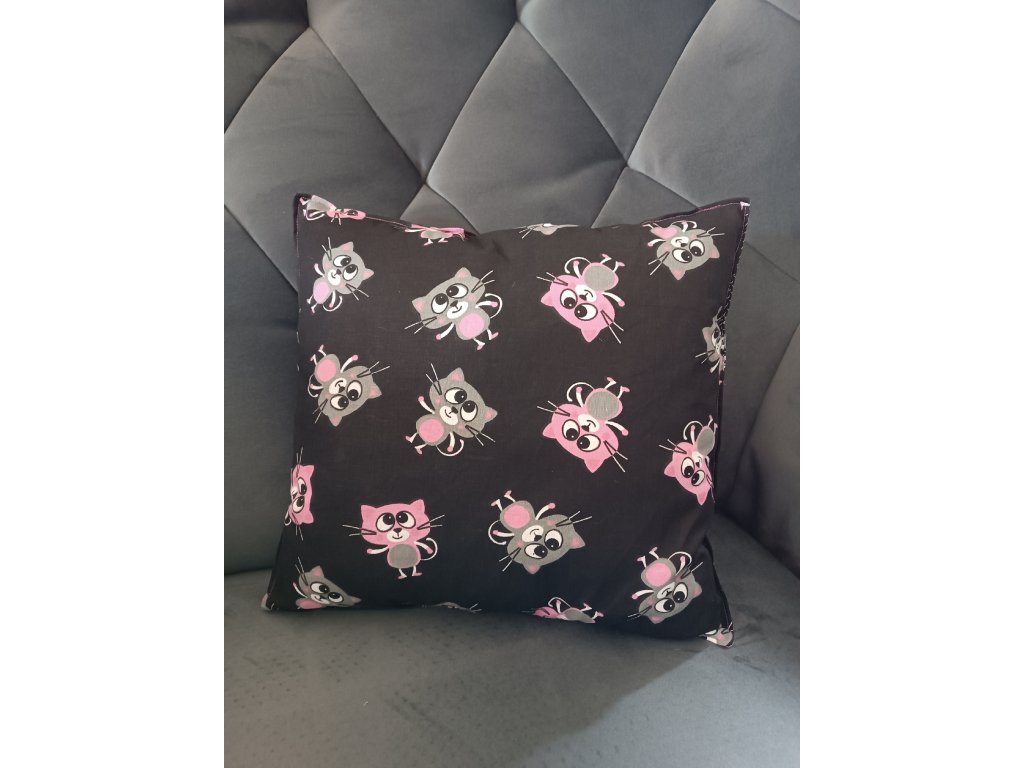 Polštářek je ušitý z bavlněné látky, je oboustranný, vyplněný dutým vláknem. Rozměr cca 34 x 34 cm. Prát na 30°C, mírně ždímat, nesušit v sušičce