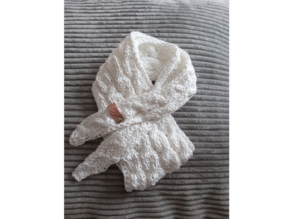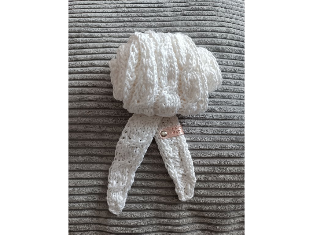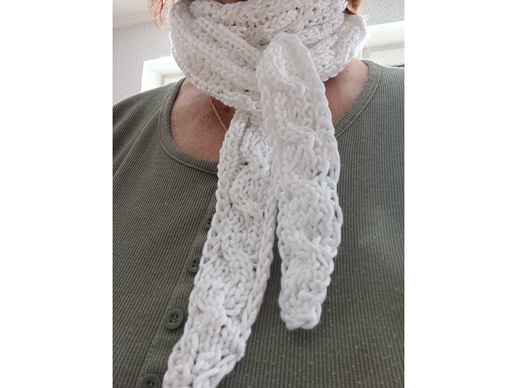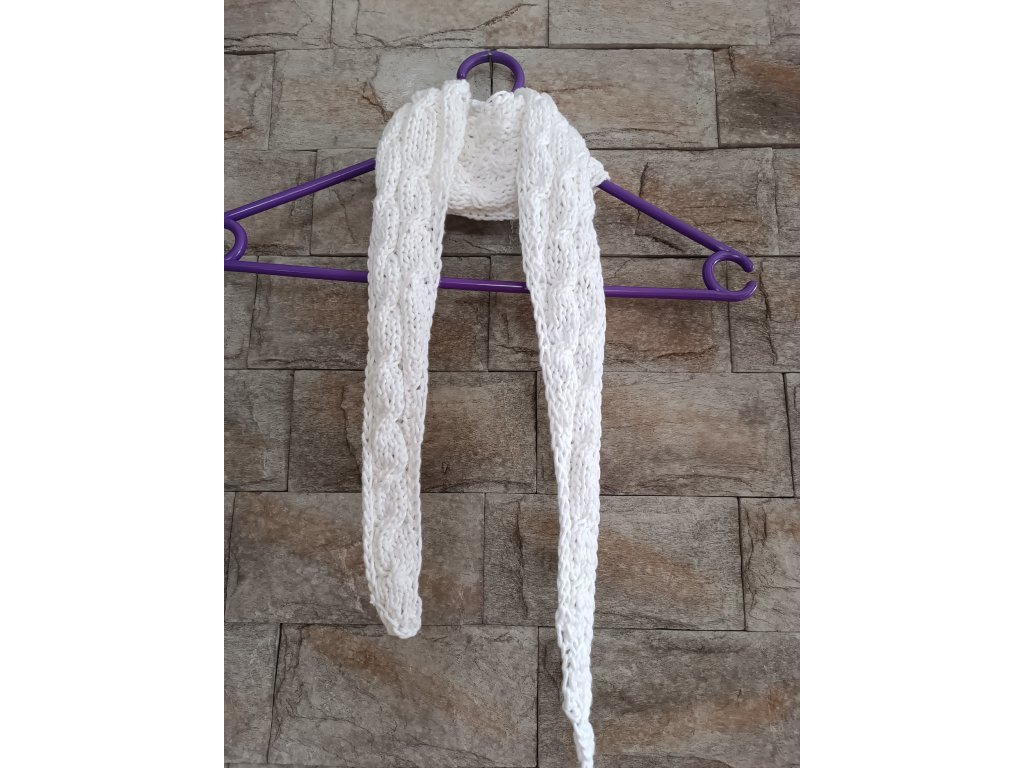 Ručně pletená šálka z velmi příjemné příze, která nekouše. Délka cca 140 x 13 cm. Módní hit letošního roku. Složení : 64%viskoza, 34%PES. Prát ručně na 30°C, neždímat, lehce vymačkat a sušit rozložené.