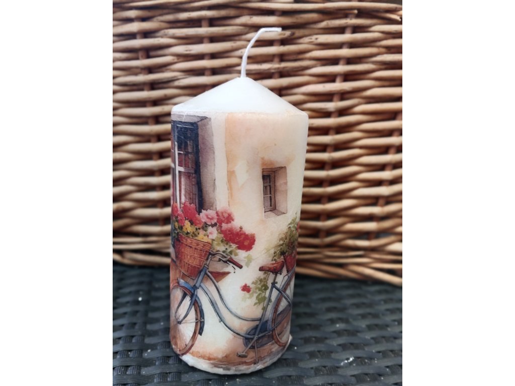 Svíčka zdobená technikou decoupage, výška 14 cm.