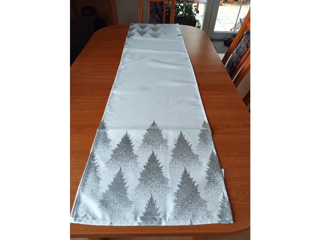 Běhoun s vánočním potiskem stříbrné stromečky. 100% polyester. Rozměr 40 x 150 cm.