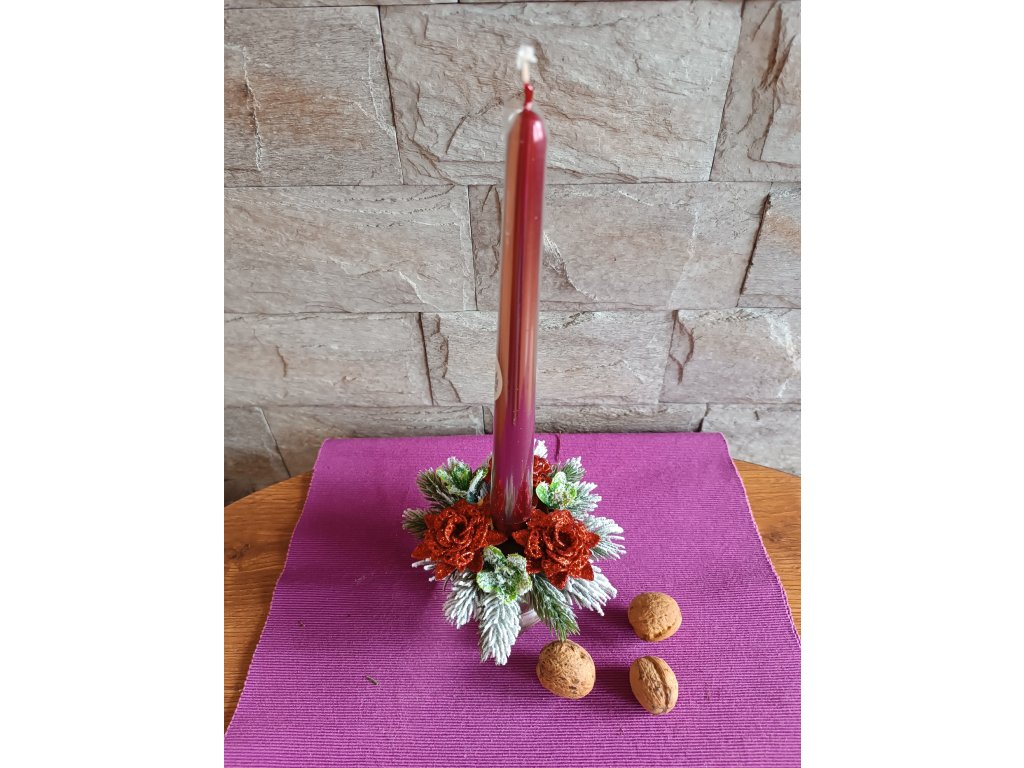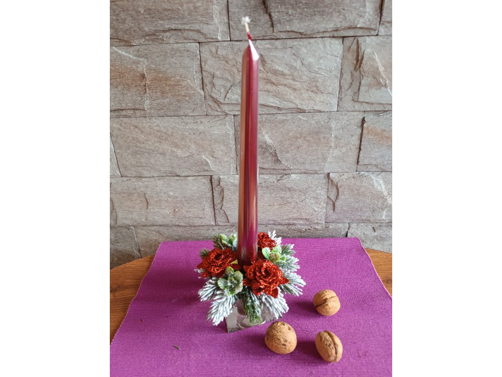 Vánoční svícen ve skleněné kostce, dozdoben umělými květinami a jehličím. Rozměr cca šířka 13 cm, výška včetně svíčky 29 cm. Svíčku nenechte hořet bez dozoru!