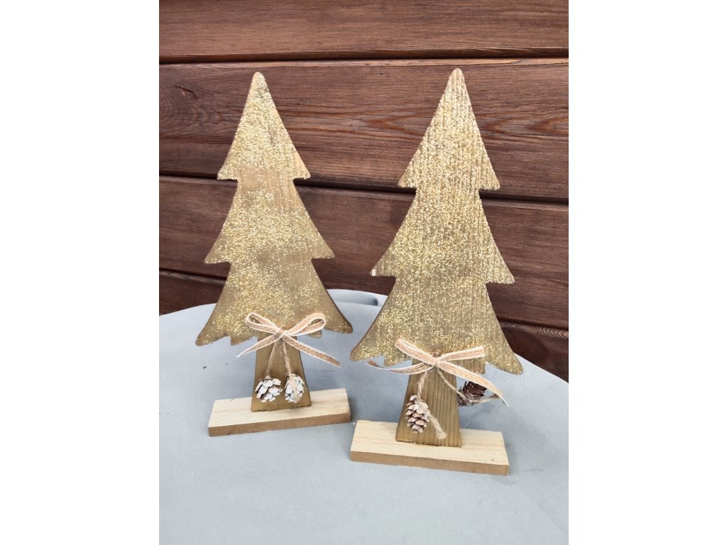 Elegantní vánoční dekorace v podobě dřevěného stromečku se zlatým třpytivým povrchem. Na spodní části je ozdoben jutovou mašlí a dvěma přírodními šiškami, které dodávají příjemný rustikální nádech. Stabilní podstavec zajišťuje snadné umístění na stůl, komodu či poličku.