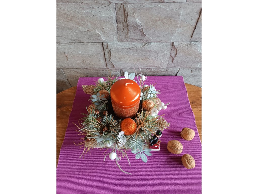 Vánoční svícen na dřevěném tácku, dozdoben umělými květinami a jehličím. Rozměr cca 15 x 15 cm. Svíčku nenechte hořet bez dozoru!