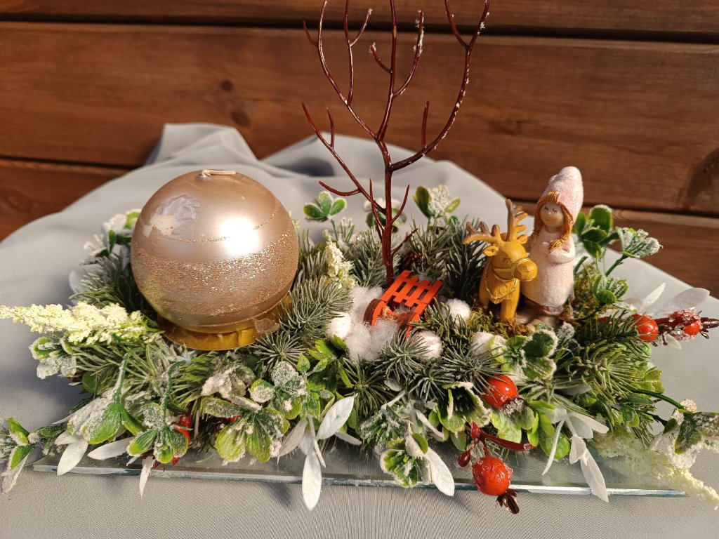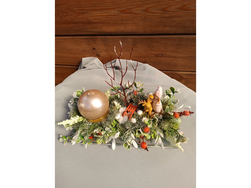 Vánoční svícen na skleněném tácku, dozdoben látkovými a umělými květinami. Délka 30 cm, šířka 16, výška 15 cm. Svíčky zapalujte pouze s dozorem dospělé osoby.