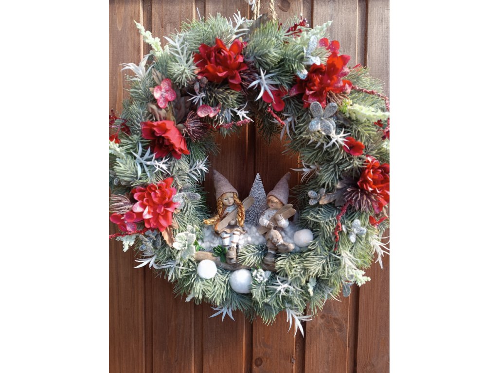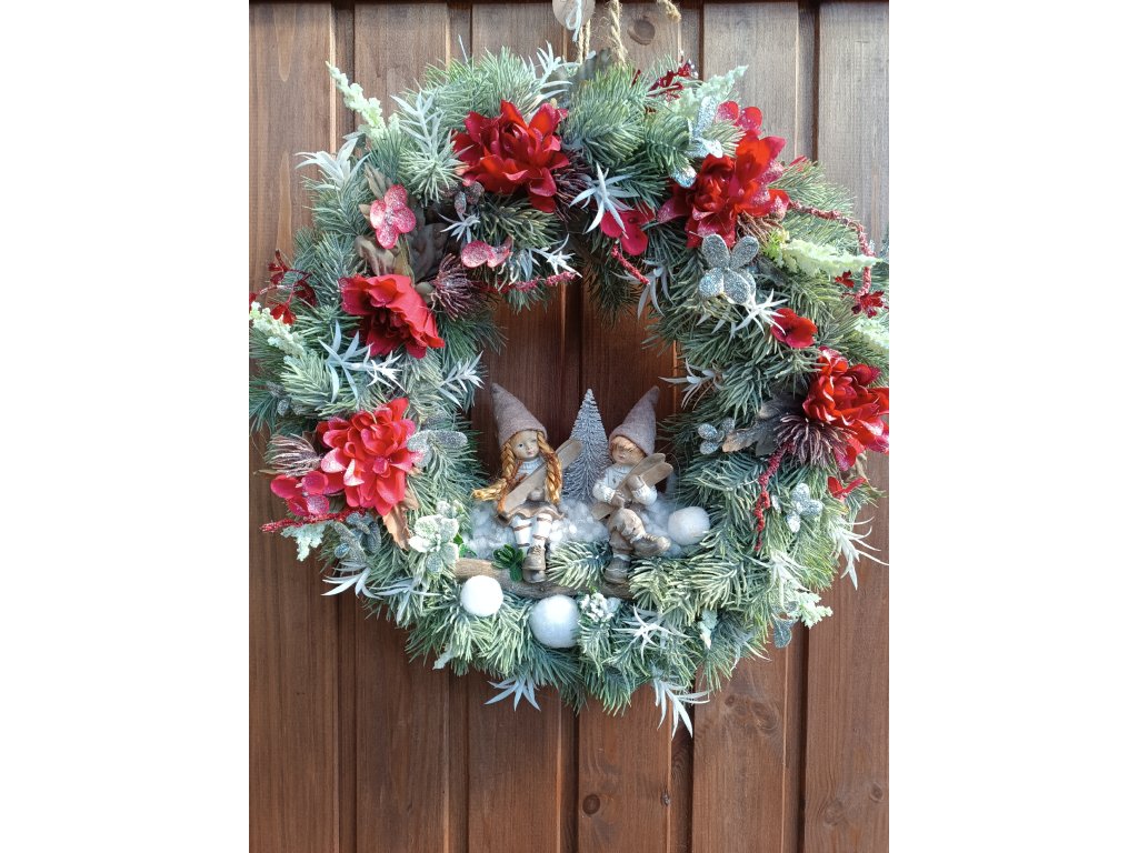 Vánoční věnec na proutěném korpusu dozdoben látkovými a umělými květinami, figurky jsou z polyresinu. Průměr cca 40 cm