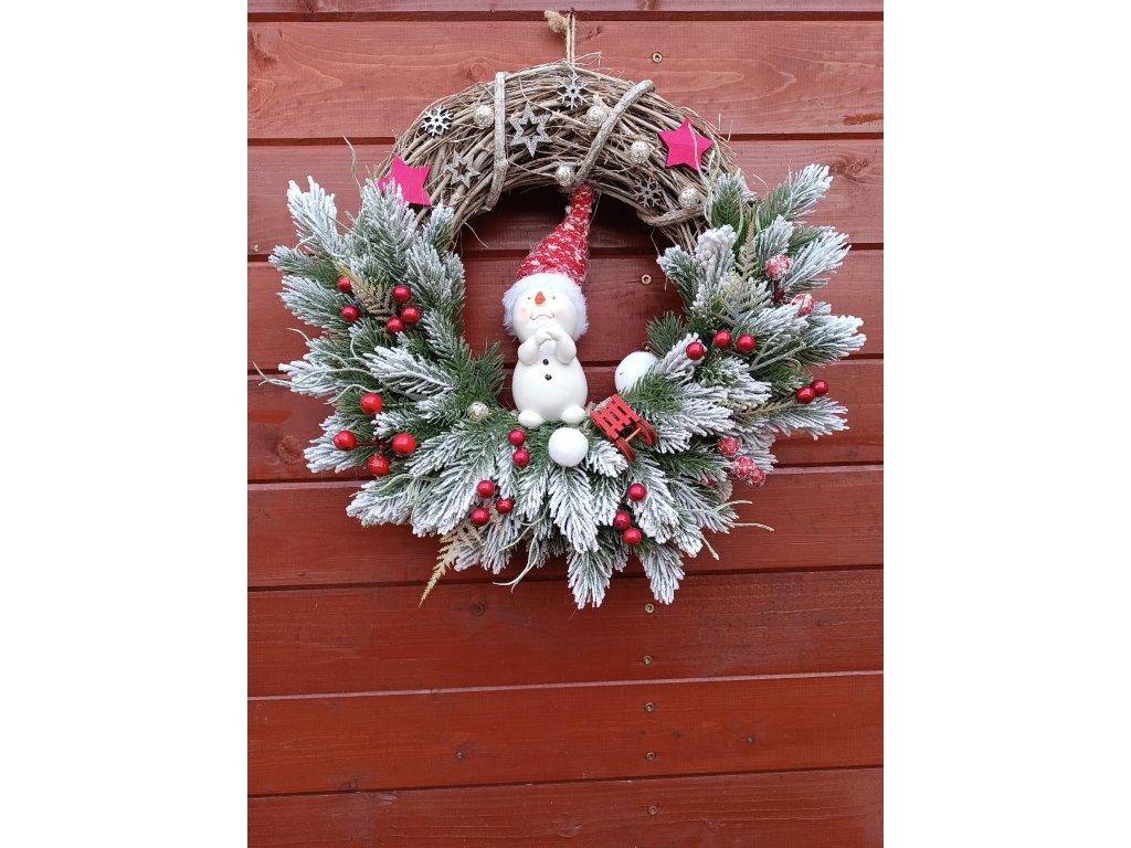 Věnec na proutěném korpusu ozdoben umělými květinami, jehličím. Průměr cca 33cm