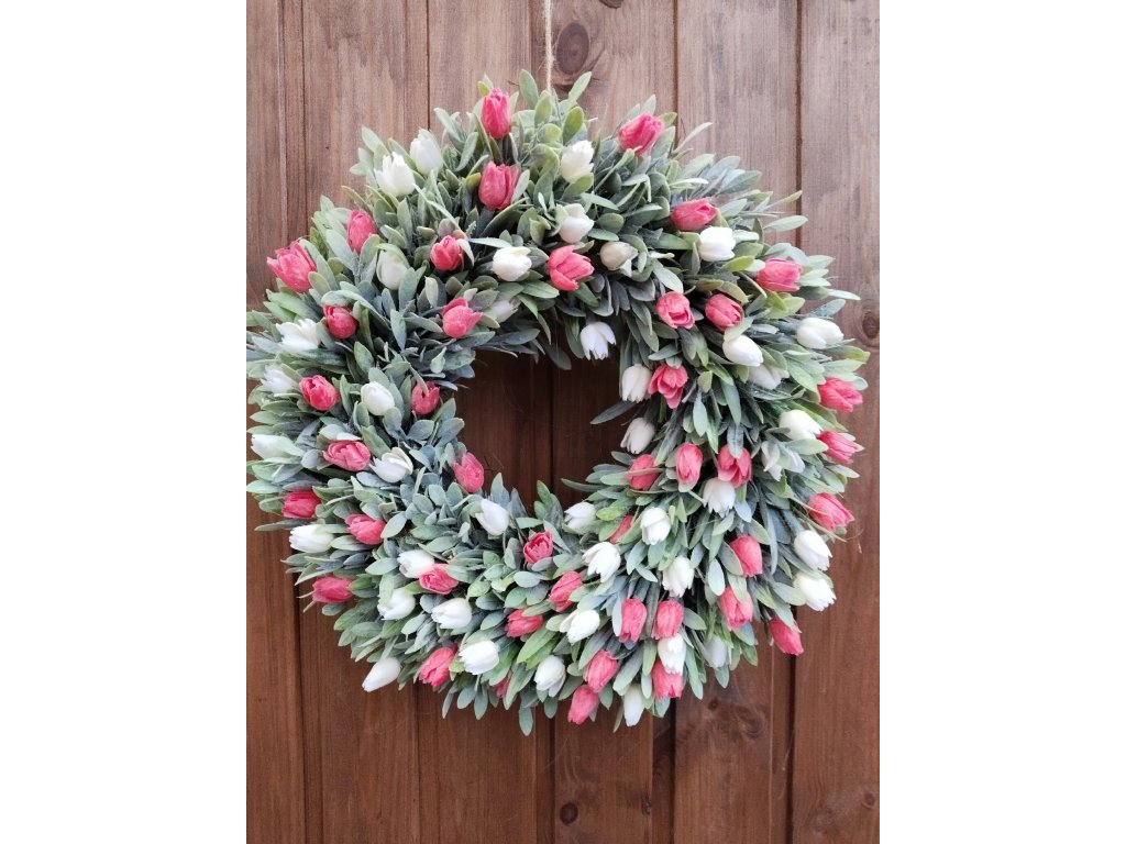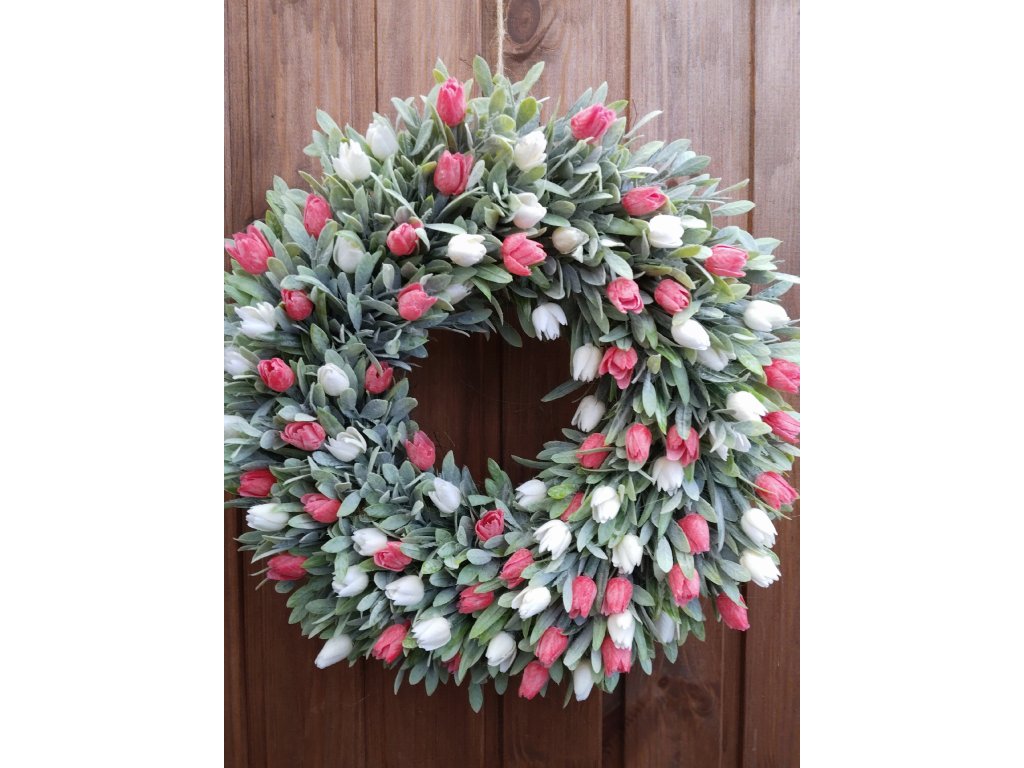 Proutěný věnec, dozdoben umělými květinami, průměr cca 35 cm