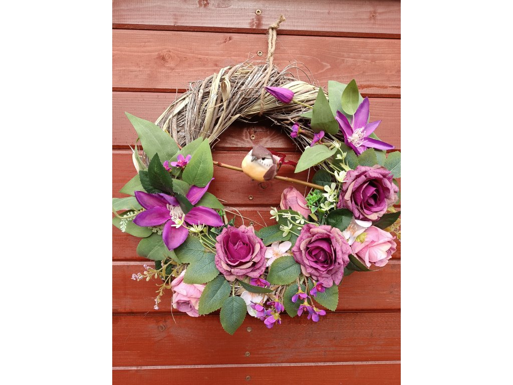 Věnec na proutěném korpusu, doplněno umělými a látkovými rostlinami. Průměr cca 28 cm.