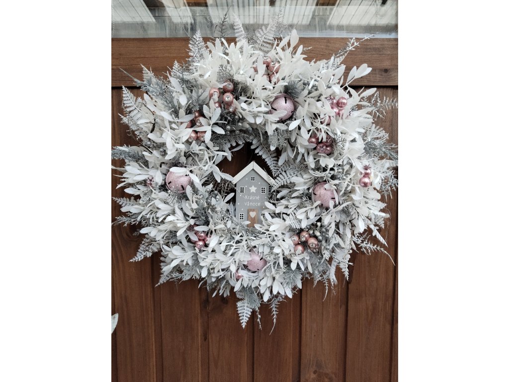 Zimní věnec na proutěném korpusu, dozdoben látkovými a umělými květinami, průměr cca 36 cm
