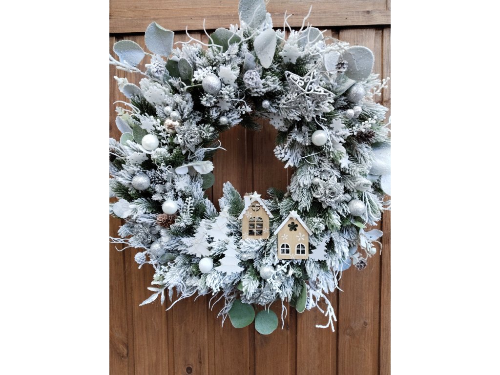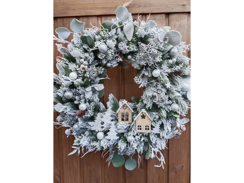 Věnec na proutěném korpusu dozdoben látkovými a umělými květinami, svítící